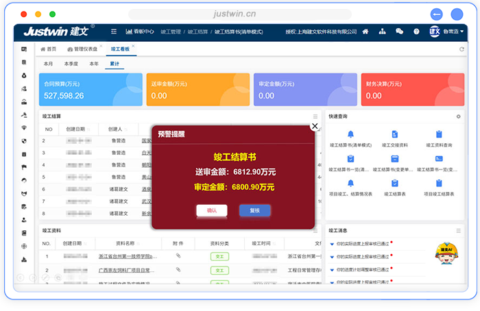 结算书审定:结算金额的审定,精准对接财务流程,可依据验收情况自动核算并审定最终结算金额,保障项目结算的准确性与公正性。
