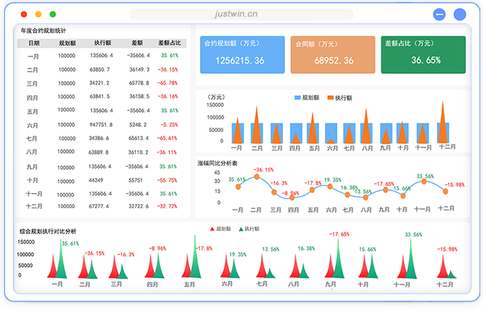 数据全景呈现:合约规划看板以直观图表展示年度合约规划统计,规划额、执行额、差额及占比一目了然,还配有综合规划执行对比分析图,让数据全景尽收眼底。